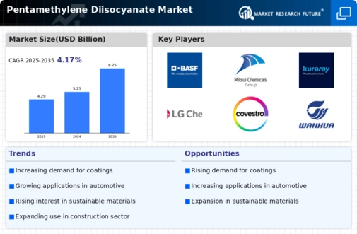 The Global Pentamethylene Diisocyanate Market Industry is also propelled by the growing awareness of environmental benefits associated with its applications. As industries shift towards sustainable practices, pentamethylene diisocyanate, known for its low environmental impact, becomes increasingly attractive. Its use in eco-friendly coatings and insulation materials aligns with global efforts to reduce carbon footprints. This shift is particularly evident in the construction and automotive sectors, where regulatory pressures are mounting. The increasing preference for sustainable materials is likely to enhance market growth, as consumers and manufacturers alike prioritize environmentally responsible options.