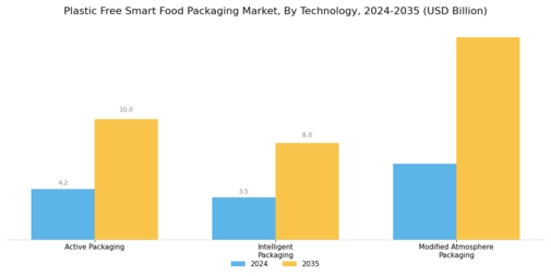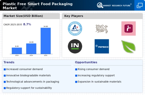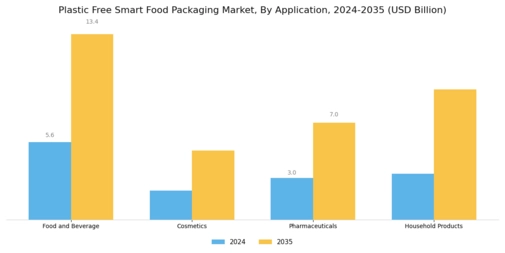 The increasing global emphasis on sustainability is a primary driver for the Global Plastic Free Smart Food Packaging Market Industry. Consumers are becoming more environmentally conscious, leading to a shift in demand towards packaging solutions that minimize plastic use. This trend is reflected in the projected market value, which is expected to reach 14.0 USD Billion in 2024 and grow to 34.8 USD Billion by 2035. Companies are responding by innovating packaging materials that are biodegradable or made from renewable resources, thus aligning with consumer preferences and regulatory pressures aimed at reducing plastic waste.