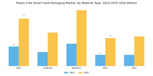 Government regulations aimed at reducing plastic waste are significantly influencing the Global Plastic Free Smart Food Packaging Market Industry. Many countries are implementing stringent policies to limit plastic usage, encouraging manufacturers to adopt alternative packaging solutions. For instance, the European Union has introduced directives that promote the use of sustainable materials in food packaging. This regulatory environment is likely to accelerate the market's growth, as businesses seek compliance while also appealing to eco-conscious consumers. The anticipated CAGR of 8.66% from 2025 to 2035 indicates a robust response to these regulatory changes.
