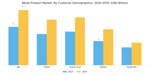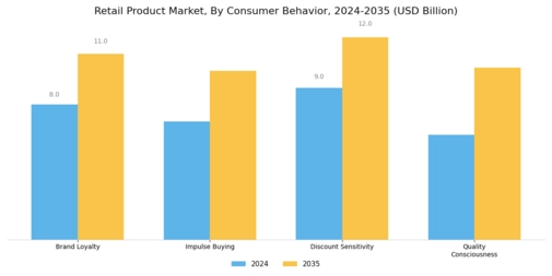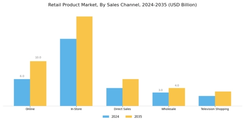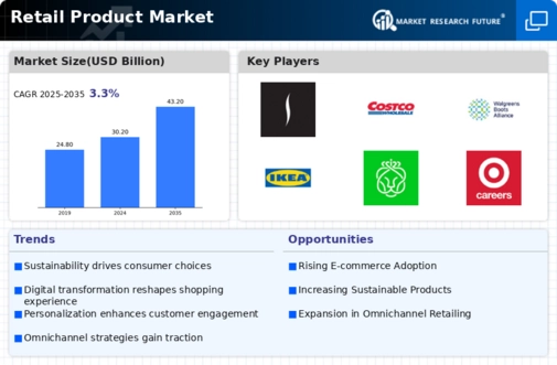 Sustainability has emerged as a crucial driver in the Global Retail Product Market Industry, influencing consumer purchasing decisions. As awareness of environmental issues grows, retailers are increasingly adopting sustainable practices, such as eco-friendly packaging and ethically sourced materials. This shift not only caters to the environmentally conscious consumer but also aligns with regulatory pressures for sustainable operations. Companies that prioritize sustainability may experience enhanced brand loyalty and market share. The industry's focus on sustainability is expected to contribute to its growth, with projections indicating a market size of 43.2 USD Billion by 2035. This trend suggests a long-term commitment to environmental responsibility within the retail sector.