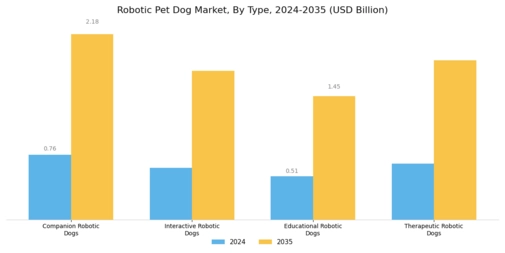 The Global Robotic Pet Dog Market Industry experiences a surge in demand for companion robots, driven by the growing need for emotional support and companionship among individuals, particularly the elderly and those living alone. As societal structures evolve, the appeal of robotic pets as alternatives to traditional pets becomes more pronounced. In 2024, the market is valued at 2.54 USD Billion, reflecting a significant shift in consumer preferences towards robotic companions. This trend is likely to continue as advancements in artificial intelligence and robotics enhance the capabilities of these devices, making them more appealing to a broader audience.