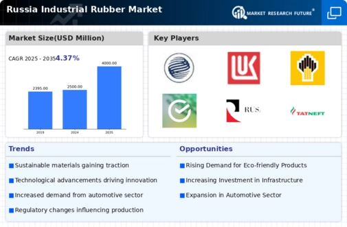 The industrial rubber market in Russia is characterized by a competitive landscape that is both dynamic and multifaceted. Key growth drivers include increasing demand from the automotive and construction sectors, alongside a push towards sustainable materials. Major players such as Sibur Holding (RU), Nizhnekamskneftekhim (RU), and Tatneft (RU) are strategically positioned to leverage these trends. Sibur Holding (RU) focuses on innovation and sustainability, investing heavily in eco-friendly production processes. Nizhnekamskneftekhim (RU) emphasizes regional expansion and partnerships, enhancing its market reach. Tatneft (RU) is known for its supply chain optimization, which allows for greater efficiency and cost-effectiveness. Collectively, these strategies shape a competitive environment that is increasingly focused on sustainability and technological advancement.