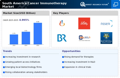 The South America Cancer Immunotherapy Market is projected to grow from 3.51 USD Billion in 2024 to 6 USD Billion by 2035.