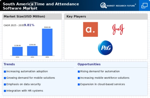 The South America Time And Attendance Software Market is experiencing a surge in demand due to the increasing need for effective workforce management. As companies expand and diversify, the complexity of managing employee schedules, attendance, and productivity rises. In 2025, the workforce in South America is projected to grow by approximately 3%, leading to a heightened focus on optimizing labor resources. Organizations are increasingly recognizing the value of time and attendance software in streamlining operations, reducing labor costs, and improving overall efficiency. This trend indicates a robust growth trajectory for the market as businesses seek to enhance their operational capabilities.