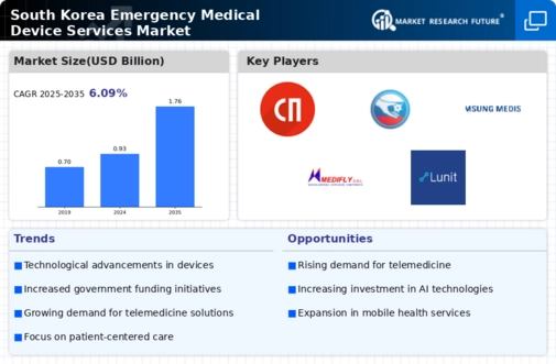 There is a growing awareness of health issues among the South Korean population, which is positively influencing the Global South Korea Emergency Medical Device Services Market Industry. Public health campaigns and educational programs are fostering a better understanding of emergency medical services and the importance of timely intervention. This heightened awareness is leading to increased utilization of emergency services, thereby driving market growth. As the population becomes more proactive about health, the demand for advanced medical devices and services is expected to rise, contributing to the market's projected growth from 2500 USD Million in 2024 to 5000 USD Million by 2035.