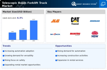 Innovations in technology significantly influence the Global Telescopic Boom Forklift Truck Market Industry. Manufacturers are increasingly integrating advanced features such as telematics, automation, and enhanced safety systems into their forklift designs. These technological advancements not only improve operational efficiency but also enhance safety for operators and surrounding personnel. As companies prioritize safety and productivity, the demand for modern telescopic boom forklifts equipped with these features is likely to rise. This trend aligns with the overall growth trajectory of the market, which is projected to reach 9.57 USD Billion by 2035.