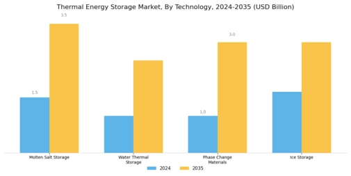 The integration of thermal energy storage systems with smart grid technologies is enhancing the operational efficiency of the Global Thermal Energy Storage Market Industry. Smart grids facilitate real-time monitoring and management of energy resources, allowing for optimized energy distribution and consumption. This synergy not only improves the reliability of energy supply but also supports the integration of renewable energy sources. As smart grid technologies continue to evolve, the demand for thermal energy storage solutions is likely to increase, further driving market growth and contributing to the projected market value of 12 USD Billion by 2035.