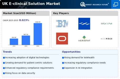 The UK Eclinical Solution Market benefits from robust regulatory frameworks that promote the adoption of eclinical solutions. The Medicines and Healthcare products Regulatory Agency (MHRA) provides guidelines that facilitate the integration of digital technologies in clinical trials. This regulatory support encourages pharmaceutical companies to invest in eclinical solutions, as compliance with these regulations is essential for successful product development. Furthermore, the UK government has been actively promoting digital health initiatives, which align with the objectives of the National Health Service (NHS) to enhance patient care through technology. As a result, the market is likely to see increased investment in eclinical solutions that comply with these regulations, fostering innovation and improving clinical trial efficiency.