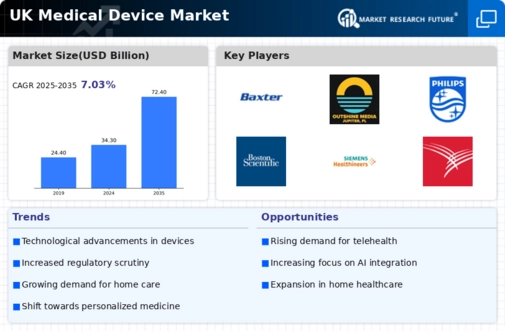 The demographic shift towards an aging population in the UK is a critical driver for the medical device market. As the proportion of elderly individuals increases, there is a corresponding rise in the prevalence of chronic diseases and age-related health issues. This demographic trend necessitates the development and adoption of medical devices tailored to the needs of older patients, such as mobility aids, monitoring devices, and home healthcare solutions. According to the Office for National Statistics, the number of people aged 65 and over is projected to reach 23 million by 2040, which will likely drive demand for innovative medical devices. Consequently, manufacturers are focusing on creating products that enhance the quality of life for this demographic, thereby expanding their market reach.
