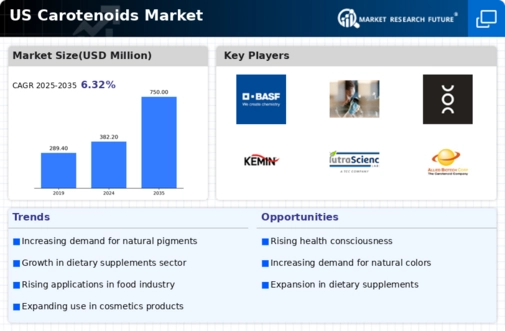 The US Carotenoids Market is characterized by a dynamic competitive landscape marked by increasing demand for natural pigments driven by rising health consciousness among consumers and the growing trend of functional foods. This market encompasses a variety of carotenoid products, including beta-carotene, lutein, astaxanthin, and lycopene, which are derived from natural sources or synthesized for various applications such as food and beverages, dietary supplements, cosmetics, and pharmaceuticals.