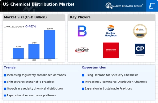 The chemical distribution market in the US is characterized by a dynamic competitive landscape, driven by factors such as increasing demand for specialty chemicals, regulatory compliance, and the need for sustainable practices. Major players like Brenntag (US), Univar Solutions (US), and IMCD Group (US) are strategically positioned to leverage these growth drivers. Brenntag (US) focuses on innovation and digital transformation, enhancing its supply chain efficiency through advanced technologies. Univar Solutions (US) emphasizes regional expansion and strategic partnerships, aiming to broaden its market reach and service offerings. IMCD Group (US) is committed to sustainability, integrating eco-friendly practices into its operations, which collectively shapes a competitive environment that prioritizes adaptability and responsiveness to market needs.