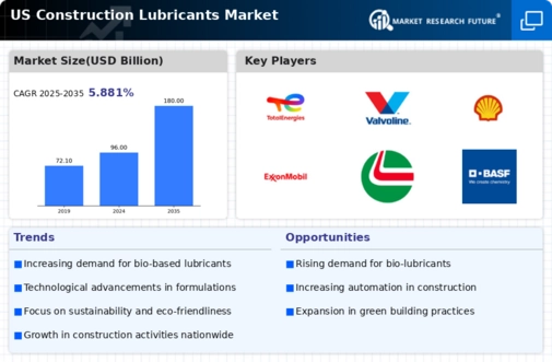 The construction lubricants market exhibits a dynamic competitive landscape, characterized by a blend of established players and emerging innovators. Key growth drivers include the increasing demand for high-performance lubricants that enhance equipment efficiency and reduce maintenance costs. Major companies such as ExxonMobil (US), Chevron (US), and Shell (US) are strategically positioned to leverage their extensive research and development capabilities, focusing on innovation and sustainability. These firms are actively investing in advanced formulations that meet stringent environmental regulations, thereby shaping a competitive environment that prioritizes both performance and ecological responsibility.