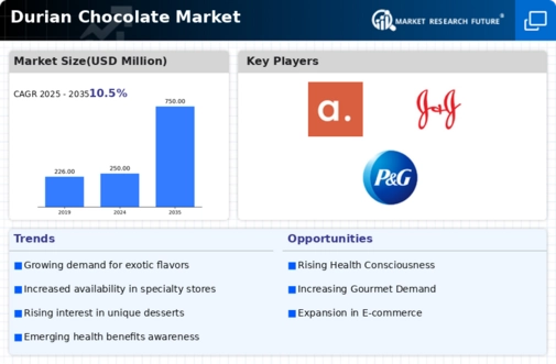 The durian chocolate market exhibits a dynamic competitive landscape characterized by a blend of innovation and strategic positioning among key players. Companies such as Durians & Chocolates Inc (US), Tropical Delights LLC (US), and ChocoDurian Corp (US) are at the forefront, each adopting distinct strategies to capture market share. Durians & Chocolates Inc (US) focuses on product innovation, frequently introducing new flavor combinations that appeal to adventurous consumers. In contrast, Tropical Delights LLC (US) emphasizes regional expansion, having recently opened new distribution channels in the Midwest, thereby enhancing its market presence. ChocoDurian Corp (US) appears to prioritize digital transformation, investing in e-commerce platforms to reach a broader audience, which reflects a growing trend in consumer purchasing behavior.