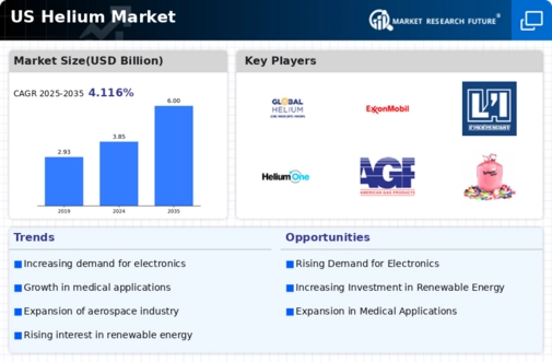 The helium market is characterized by a competitive landscape that is increasingly shaped by innovation, strategic partnerships, and regional expansions. Key players such as Air Products and Chemicals Inc (US), Linde plc (US), and Matheson Tri-Gas Inc (US) are actively pursuing strategies that enhance their market positioning. Air Products and Chemicals Inc (US) has focused on expanding its production capabilities, which appears to be a response to the growing demand for helium in various applications, including electronics and healthcare. Linde plc (US) emphasizes sustainability in its operations, indicating a shift towards environmentally friendly practices that may resonate well with contemporary consumer preferences. Meanwhile, Matheson Tri-Gas Inc (US) is enhancing its supply chain efficiency, which could potentially improve its competitive edge in a market that is becoming increasingly fragmented.