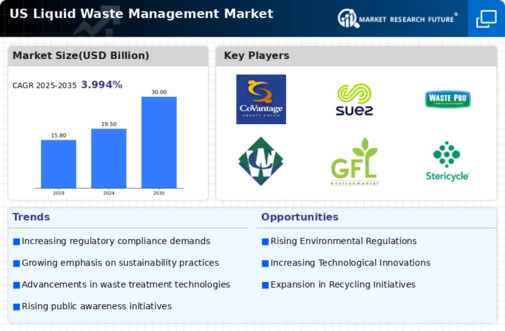 The liquid waste management market in the US is characterized by a competitive landscape that is increasingly shaped by sustainability initiatives, technological advancements, and regulatory pressures. Key players such as Waste Management Inc (US), Republic Services Inc (US), and Veolia North America (US) are actively pursuing strategies that emphasize innovation and operational efficiency. Waste Management Inc (US) has focused on enhancing its recycling capabilities, while Republic Services Inc (US) has invested in digital transformation to optimize waste collection routes. Veolia North America (US) appears to be leveraging its global expertise to implement advanced waste treatment technologies, thereby positioning itself as a leader in environmentally responsible waste management solutions.