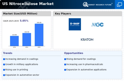 In September 2025, Nitrocellulose Corporation (US) entered into a strategic alliance with a leading automotive manufacturer to develop specialized nitrocellulose-based coatings. This partnership is indicative of a broader trend towards collaboration between chemical manufacturers and end-users, aiming to create tailored solutions that meet specific industry needs. Such alliances may enhance product development cycles and foster innovation, ultimately benefiting both parties involved.