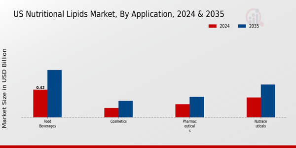 The Application segment of the US Nutritional Lipids Market plays a crucial role in driving the industry forward, showcasing its versatility across various domains such as Food and Beverages, Nutraceuticals, Cosmetics, and Pharmaceuticals. Each of these areas not only contributes to the overall market growth but also reflects changing consumer preferences and the growing emphasis on health and wellness in the United States. The Food and Beverages segment is increasingly incorporating nutritional lipids, catering to a consumer demand for fortified foods that provide significant health benefits, particularly in areas related to heart health and weight management.