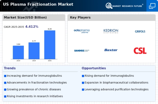 The US Plasma Fractionation Market is characterized by a dynamic competitive landscape where various players strive to enhance their portfolios and market positioning through innovation and expansion. As the global demand for plasma-derived medicinal products continues to grow, companies operating within this sector are focusing on advancing their technologies, improving operational efficiency, and expanding their capacity to meet healthcare needs.