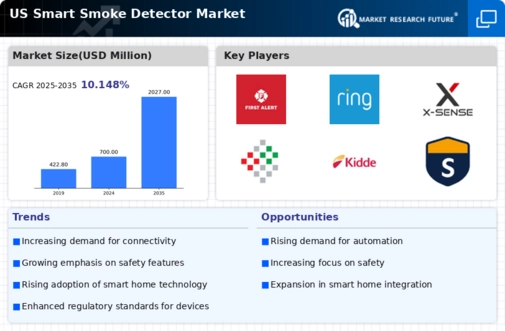 The US Smart Smoke Detector Market has witnessed significant growth in recent years, driven by advancements in technology and increased awareness of the importance of fire safety. As consumers increasingly seek integrated solutions for home automation, smart smoke detectors have transformed from traditional models into sophisticated devices that offer real-time alerts, connectivity with smartphones, and enhanced safety features. The competitive landscape of this market comprises various players, each vying for market share by leveraging innovative technologies, enhancing product functionalities, and expanding distribution channels.