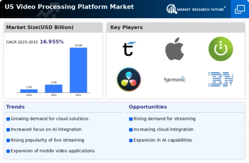 The video processing platform market is characterized by a dynamic competitive landscape, driven by rapid technological advancements and increasing demand for high-quality video content. Major players such as Adobe (US), Apple (US), and NVIDIA (US) are strategically positioned to leverage innovation and partnerships to enhance their offerings. Adobe (US) focuses on integrating AI capabilities into its Creative Cloud suite, thereby streamlining workflows for content creators. Apple (US), on the other hand, emphasizes seamless integration across its ecosystem, enhancing user experience through its video processing tools. NVIDIA (US) continues to push the envelope with its GPU technology, catering to both gaming and professional markets, which collectively shapes a competitive environment that is increasingly reliant on technological prowess and user-centric solutions.
