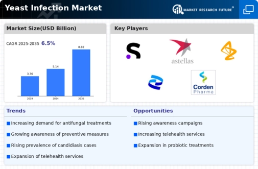 There is a notable increase in awareness and education regarding yeast infections, which significantly impacts the Global Yeast Infection Market Industry. Campaigns aimed at educating the public about symptoms, causes, and treatment options are becoming more prevalent. This heightened awareness encourages individuals to seek medical advice and treatment, thereby driving market growth. As more people understand the importance of addressing yeast infections, the market is projected to grow at a CAGR of 5.02% from 2025 to 2035, reaching an estimated 8.82 USD Billion by 2035.
